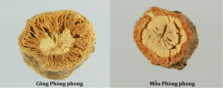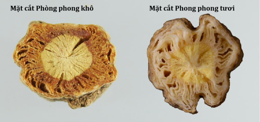 Qua quan sát các mẫu thu thập được, có thể thấy màu sắc phần vỏ trên mặt cắt của Phòng phong không đồng nhất. Mặt cắt của Phòng phong khô có màu nhạt hơn. Khi làm ẩm và cắt lát, các ống tinh dầu trong Phòng phong bị cắt đứt, chất dầu bên trong sẽ khuếch tán ra bề mặt cắt, và dưới tác dụng của độ ẩm, oxy và nhiệt độ, màu sắc sẽ trở nên sẫm hơn. Đây là lý do tại sao màu sắc phần vỏ trên mặt cắt của Phòng phong bị đậm màu.