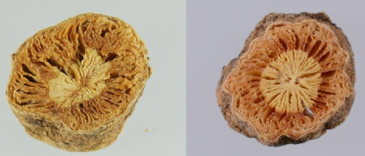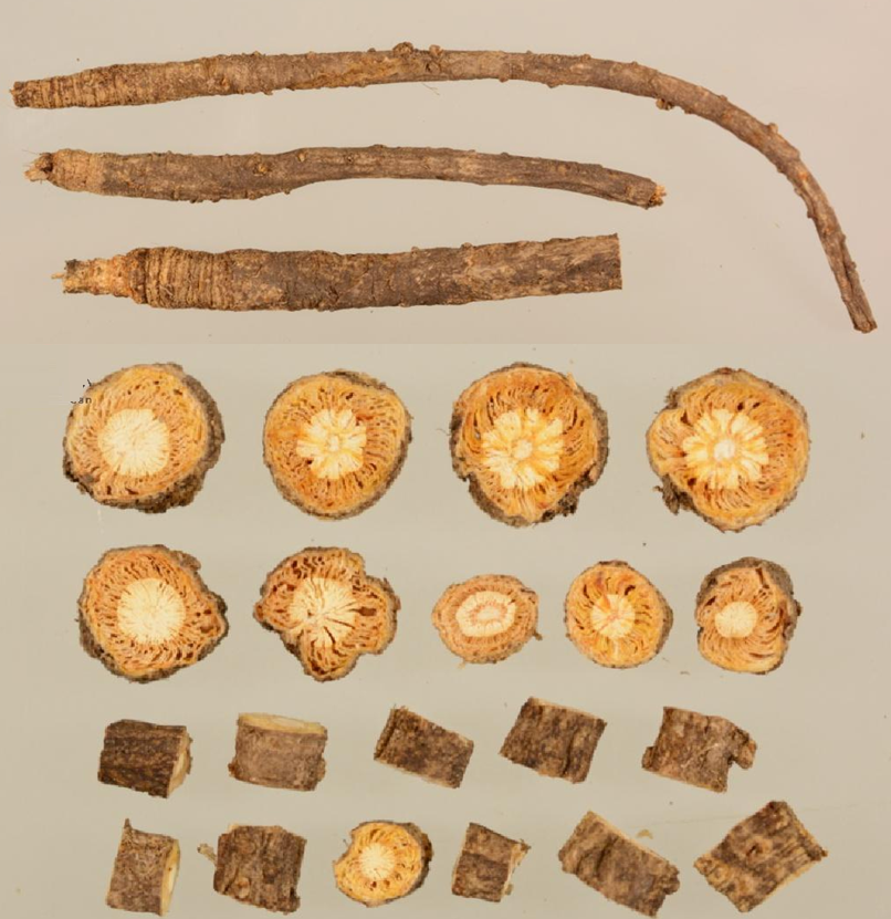 | Chất liệu | Rắn chắc, thể nhẹ (theo Dược điển), dễ bẻ gãy, mặt cắt không bằng phẳng. | Rắn chắc, thể nặng hơn loại hoang dã (theo mô tả), dễ bẻ gãy, mặt cắt khá phẳng. | Chất liệu tổng thể xốp nhẹ hơn. Rễ mẹ thường có khe nứt ở mặt cắt. |