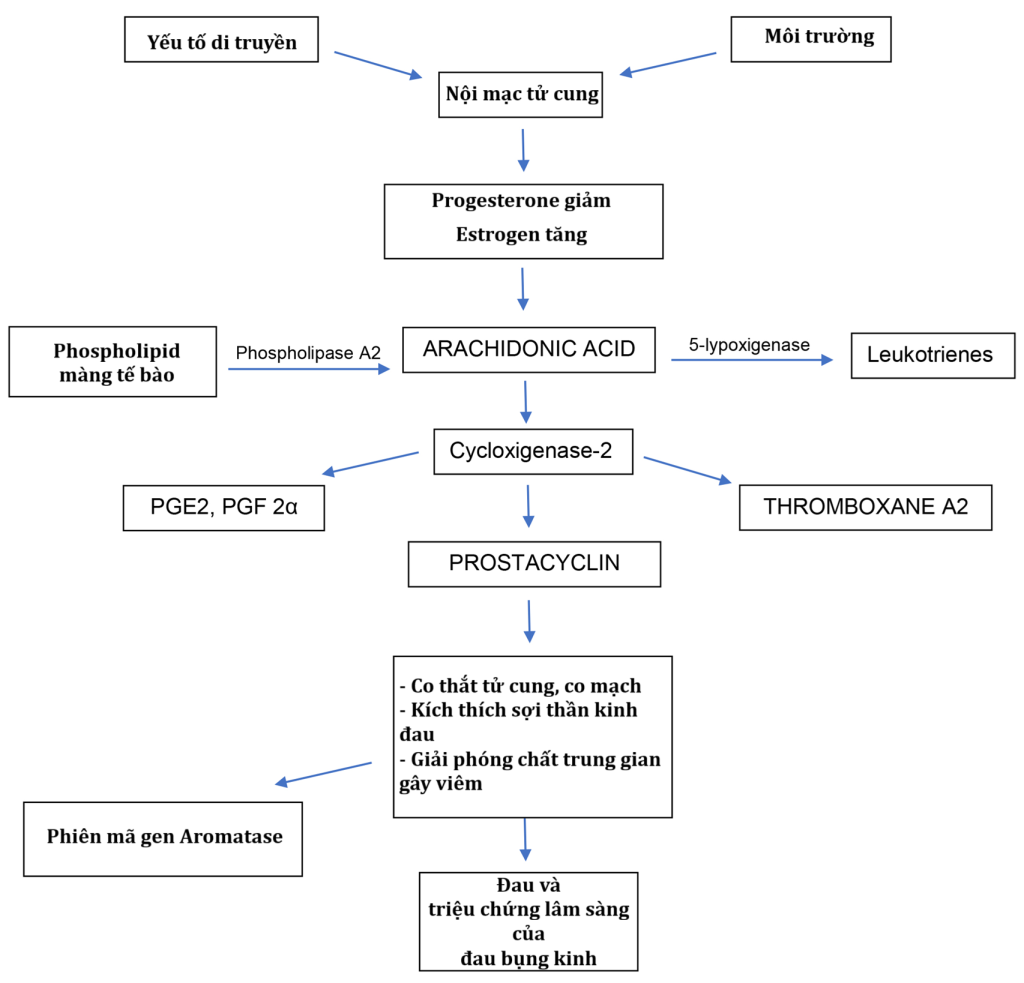 - Sản xuất estrogen tăng lên sau khi ngừng progesterone sẽ làm tăng sản xuất prostaglandin (PG) trong nội mạc tử cung thông qua hoạt hóa cycloxigenase-2 (COX-2) và yếu tố hạt nhân kappa B (NF-kB), một yếu tố phiên mã hạt nhân chịu trách nhiệm kích hoạt các gen liên quan đến chuỗi phản ứng viêm NF-kB kích hoạt phiên mã gen COX-2, chịu trách nhiệm tổng hợp chuỗi phản ứng PG lớn, gây ra tình trạng viêm trong nội mạc tử cung.