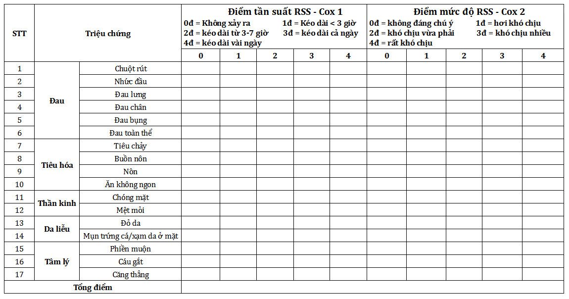 Thang điểm được đánh giá dựa trên tổng điểm tần suất (RSS-Cox 1) và tổng điểm mức độ (RSS- Cox 2). Điểm thấp hơn cho thấy sức khoẻ tốt hơn.