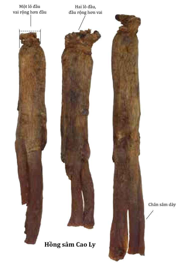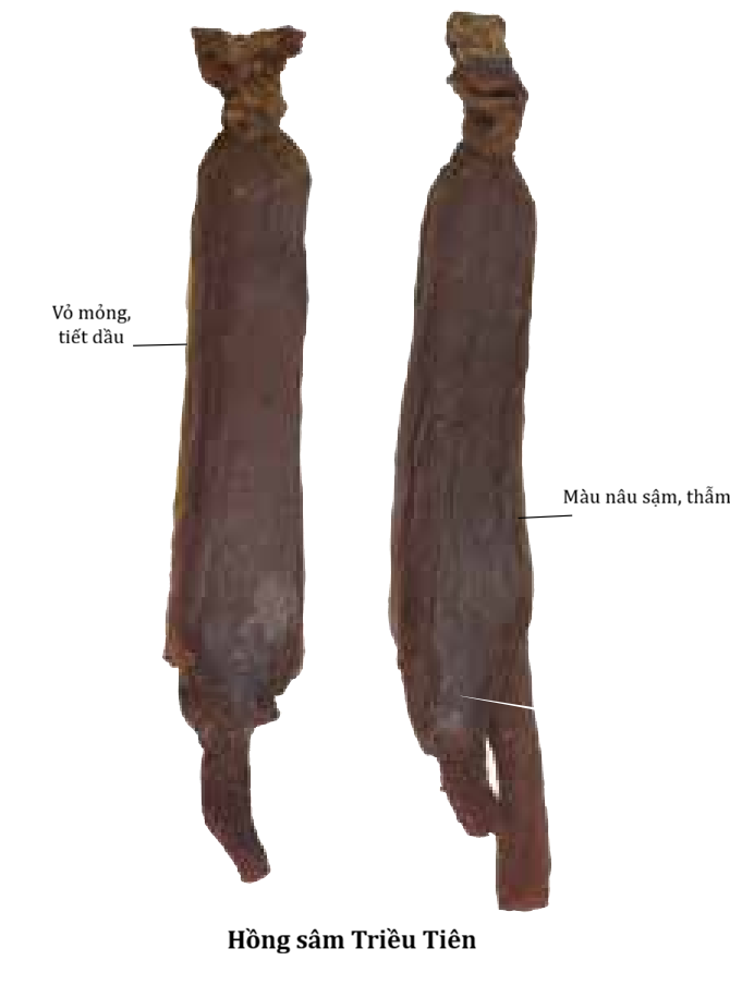 Tính chất: Tương tự Cao Ly sâm nhưng bề mặt từ nâu đỏ đến nâu đỏ sậm, bóng loáng, hơi trong suốt. Da mịn màng, dầu nhuận, thân chắc, nặng.